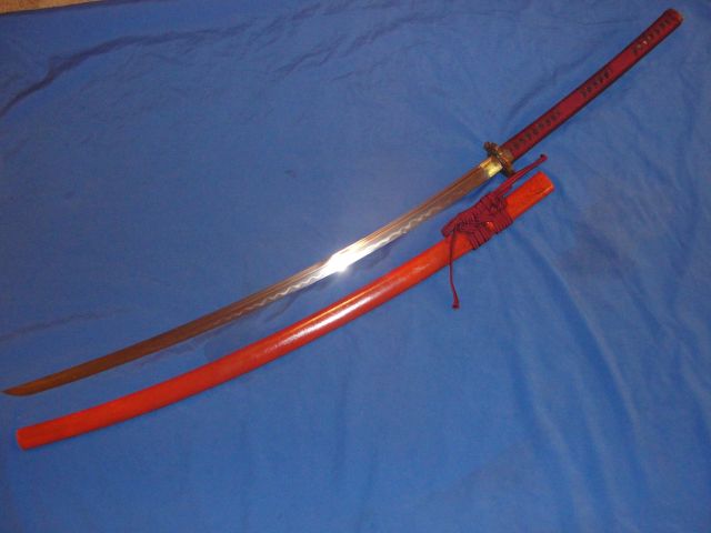 The wood siya is black under red cracked lacquer and it is sealed with 6 coats of hard, clear lacquer. The overall length of this sword is a impressive 55". As I said tis is a beast and very eye catching, Truly a one of a kind piece. This one was made when we were still in Nevada and I was still experimenting with both blade length and blade styles.