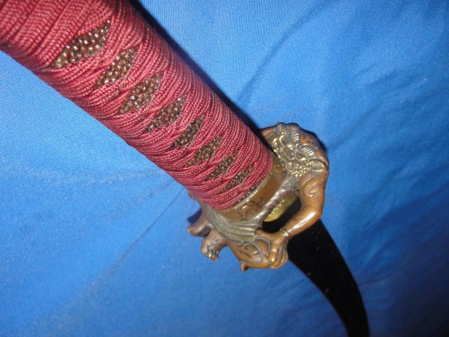 The tsuka is wood covered in red same-gawa wrapped in red silk in my modified "battle wrapping". It is 17" i length and secured to the nakago with two (2) mekugi.