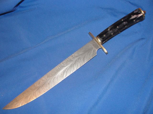 Item Number 04 is very nice Bowie/Belt knife in a "feather" pattern. The  single edged 10" long blade is welded from L-6 and1084 steel. This is a elegant knife!