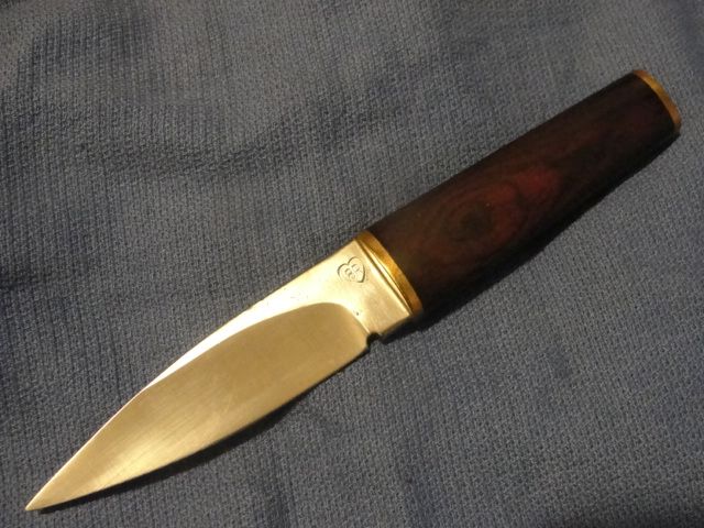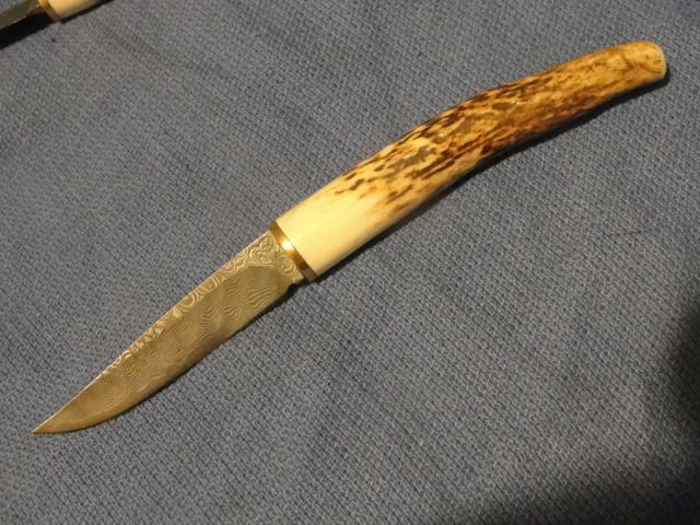Item No PK 02 is a "patch knife" designed blade forged from a 3 piece billet with a 52100 centre core and laminate material on either side. 3" b lade length with Red Deer antler tine grip and phosphor bronze bolster. This is a very 'cute" little knife and a very useful size. (no sheath)