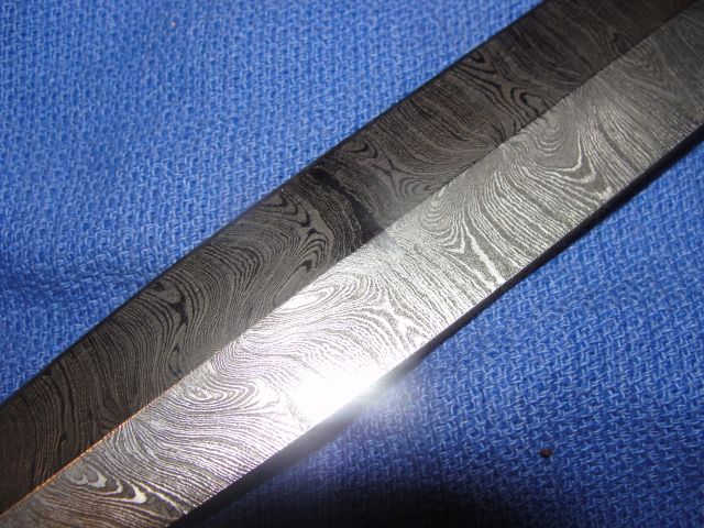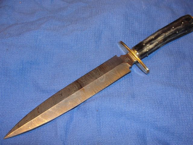 Item No. 01 is a very nice pattern welded dagger, welded from 10905. L-6 and some meteorite iron in a "Maiden's Hair" pattern. this one came out a bit tighter in the patterning than I usually do. Blade length is 7 1/2" and shows excellent patterning. The blackened bone grip is set with phosphor bronze studs and has phosphor bronze guard and pommel plates.