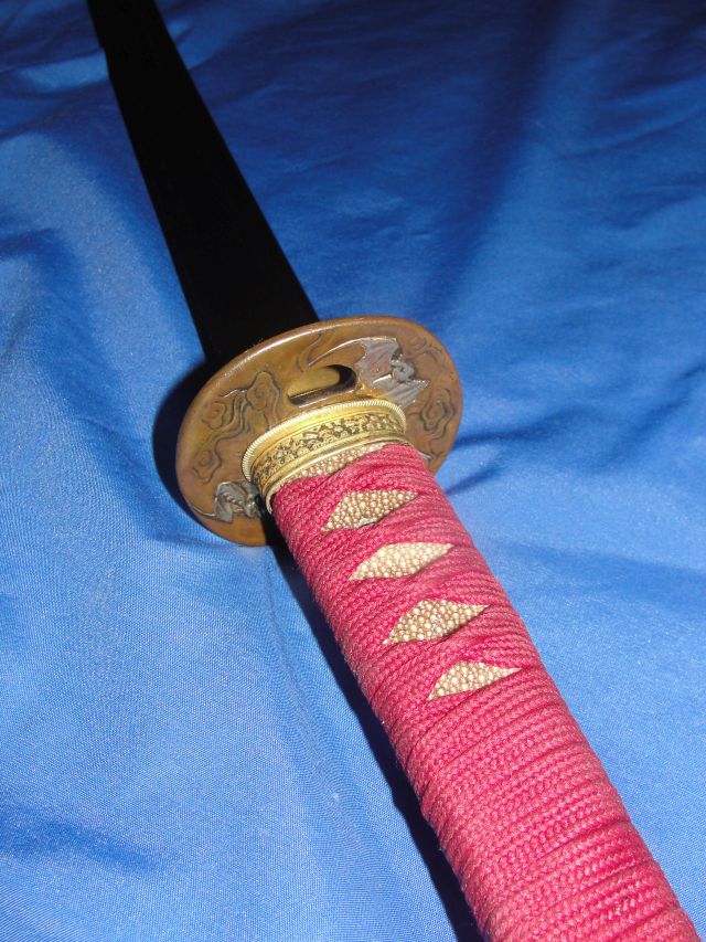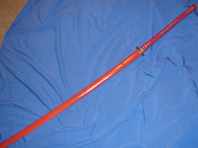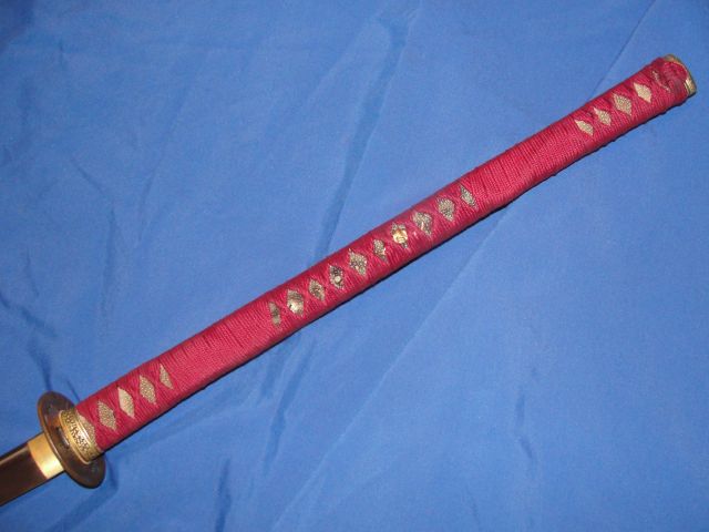 The tsuka is wood with natural tiger ray same-gawa under red slik ito wrapped in my modified 'battle wrap" style and it is 19 1/2" in length and secured by two (2) mekugi.