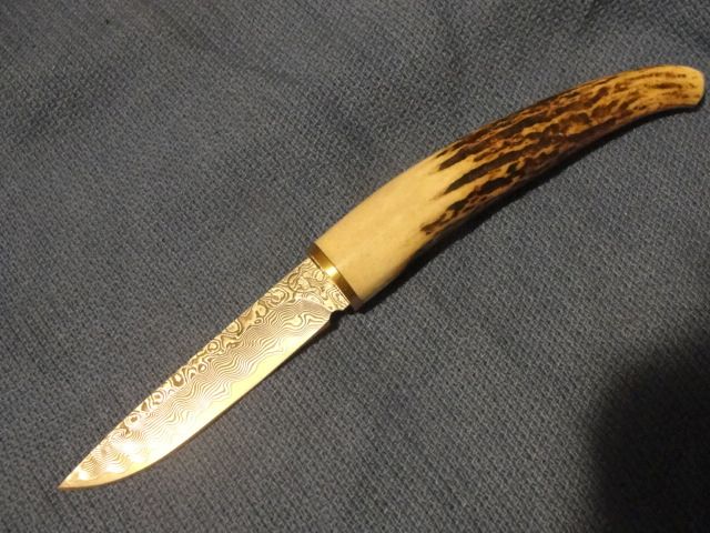 Item No PK03 is a neat little "patch knife" with a 52100 steel core and laminated sides. 3" blade length with Red Deer antler tine grip and phosphor bronze bolster. This is a very handy size for a knife..(No sheath)